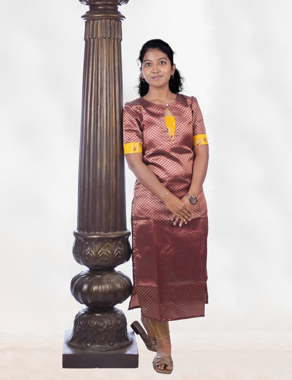 Description: Banarasi puff sleeve kurti Color: Maroon with Mustard Yellow Fabric: Banarasi Neckline: Round neck...