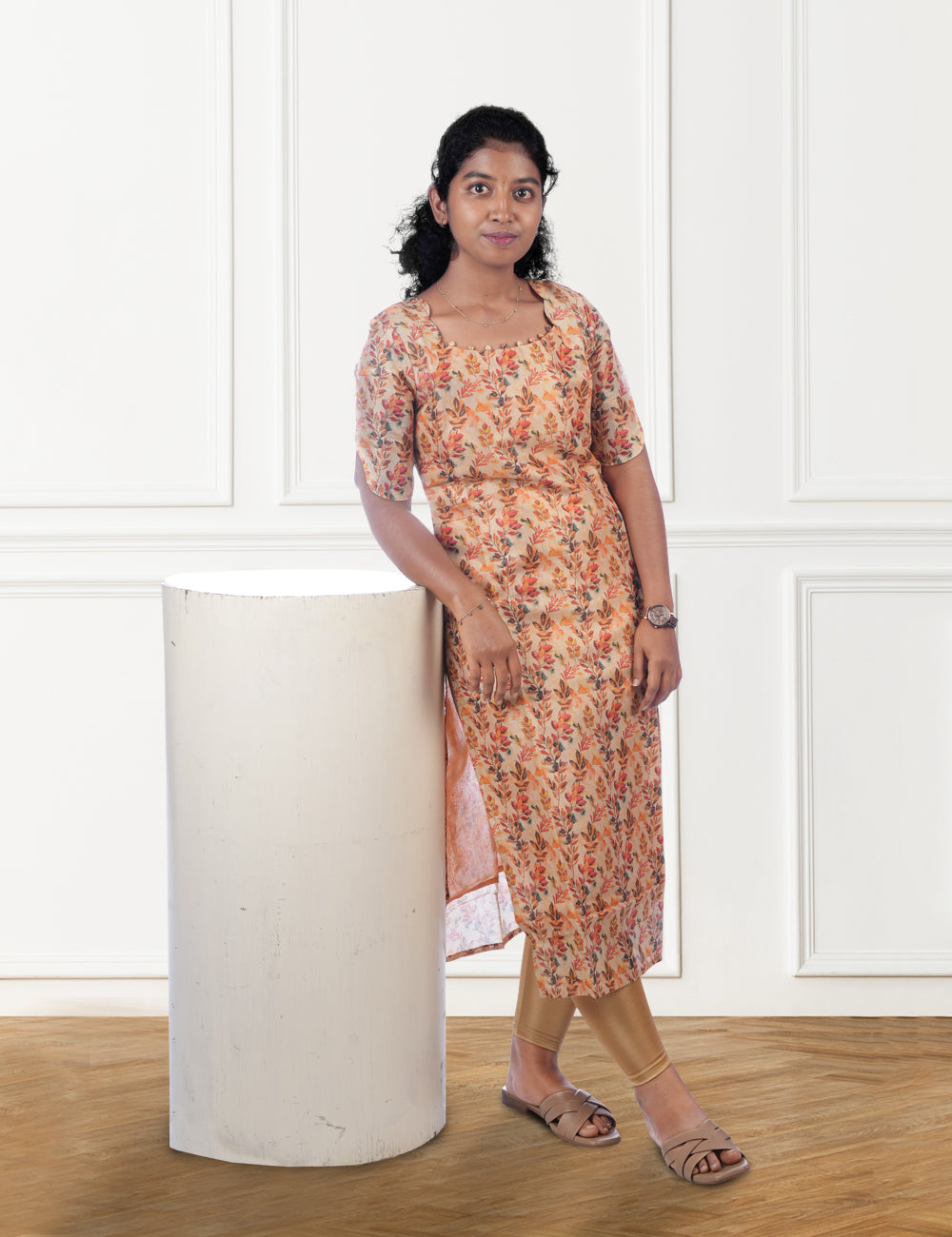 Description: Sandal all over floral printed Gold Silk / Tissue LYNAE kurti Color: Sandal with...