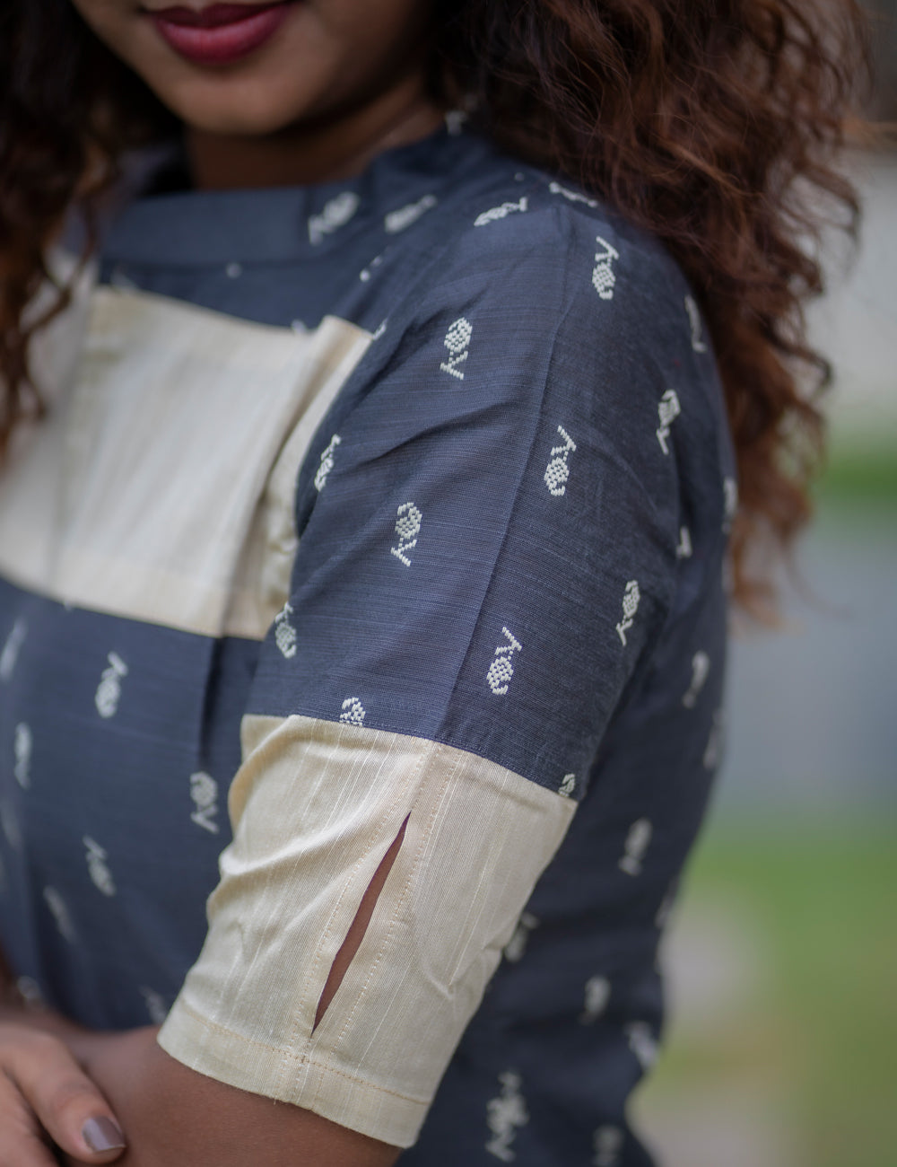 Description: This outfit offers a smart, contemporary ethnic look, ideal for office wear, casual gatherings, or minimalist festive styling. The use of contrast cream details on a dark base gives it a refined yet bold vibe.