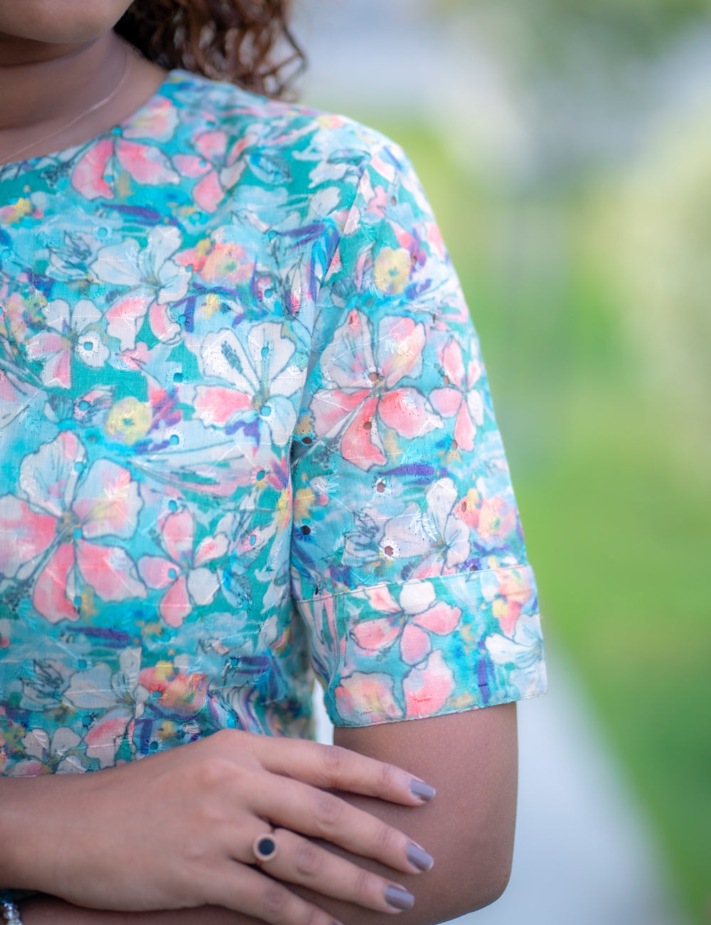 Pattern: Floral, soft pastel colors (blue, pink, green).