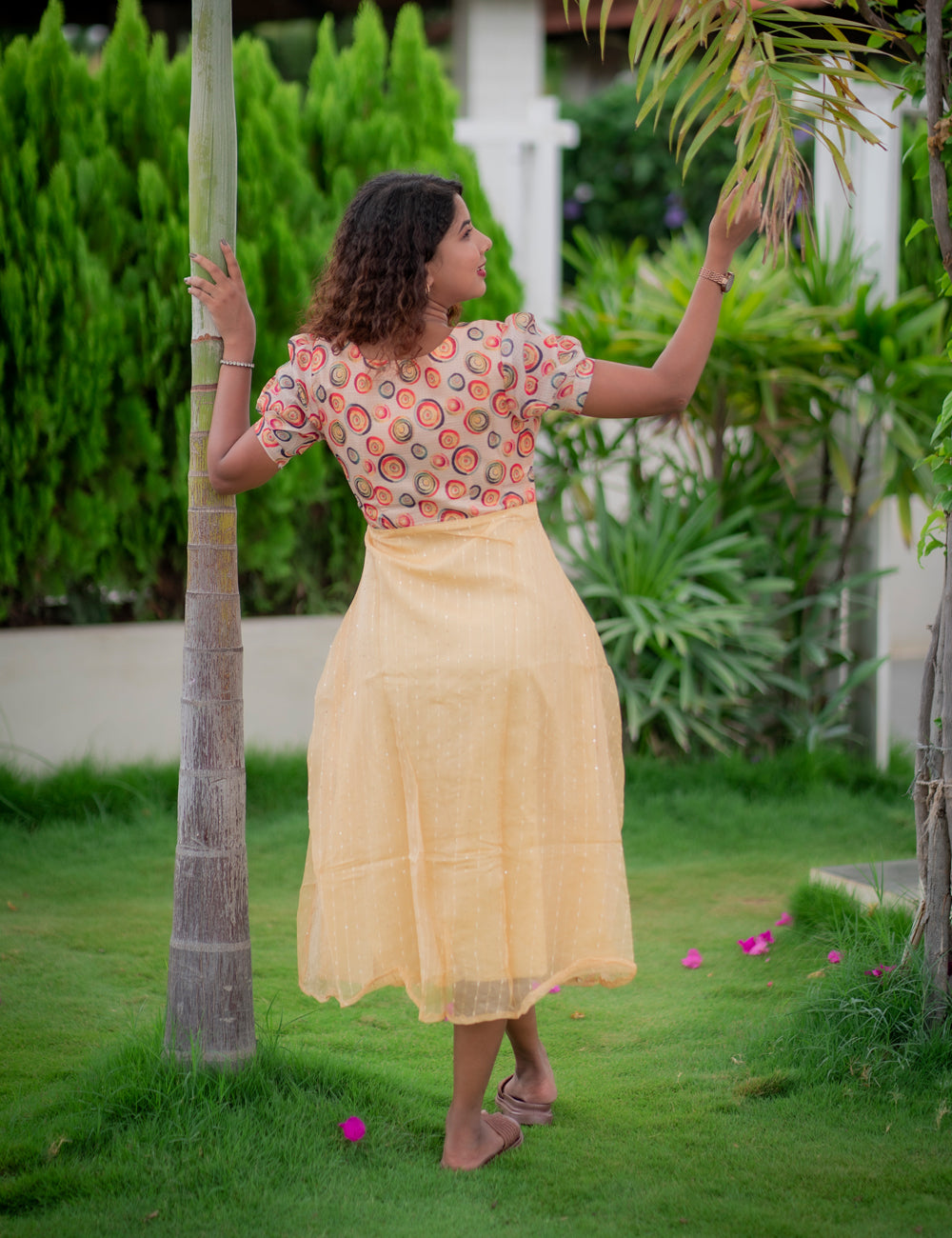 A modern, elegant two-piece outfit consisting of a colorful circular-patterned top and a soft pastel yellow skirt. The top has playful round motifs in warm tones, while the skirt adds a subtle shimmer, making it perfect for casual outings or festive gatherings.